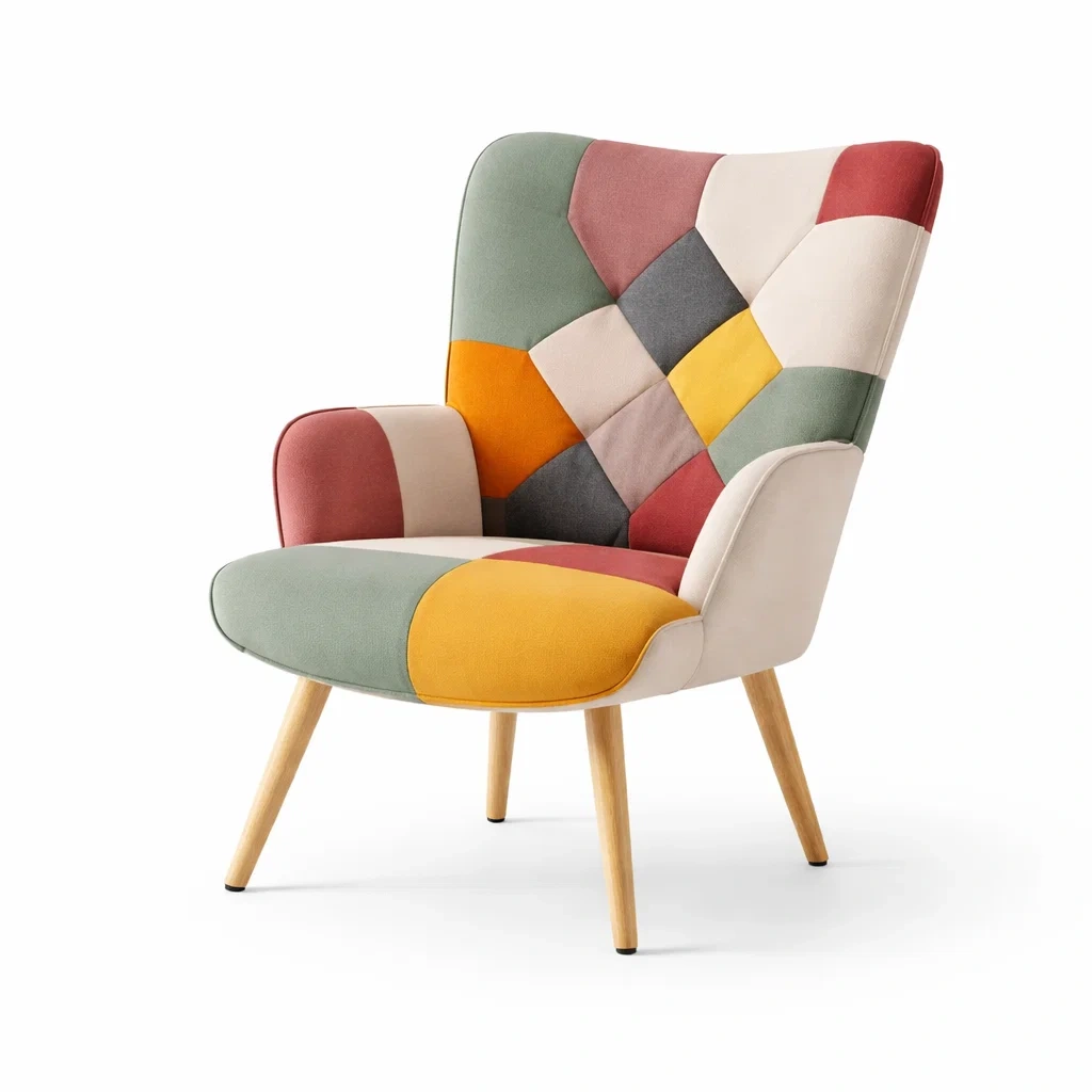 Fauteuil patchwork multicolore en tissu avec pieds en bois