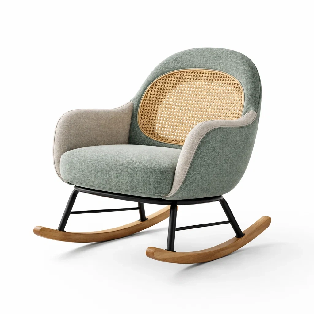Matériaux : Cadre en métal, base en bois de chêne, dossier en rotin, revêtement en tissu polyester