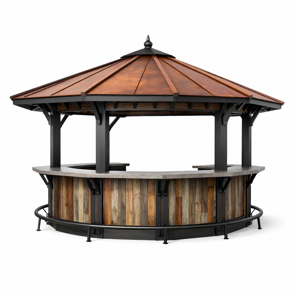 Ce kiosque hexagonal est fabriqué avec une structure en acier robuste et des panneaux en bois naturel. Son toit en métal de finition cuivre assure une protection efficace contre les intempéries.